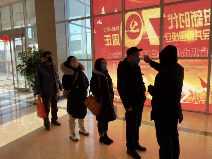 物產(chǎn)化工黨支部黨員堅(jiān)守防控工作一線,做好體溫測量和消毒工作。?